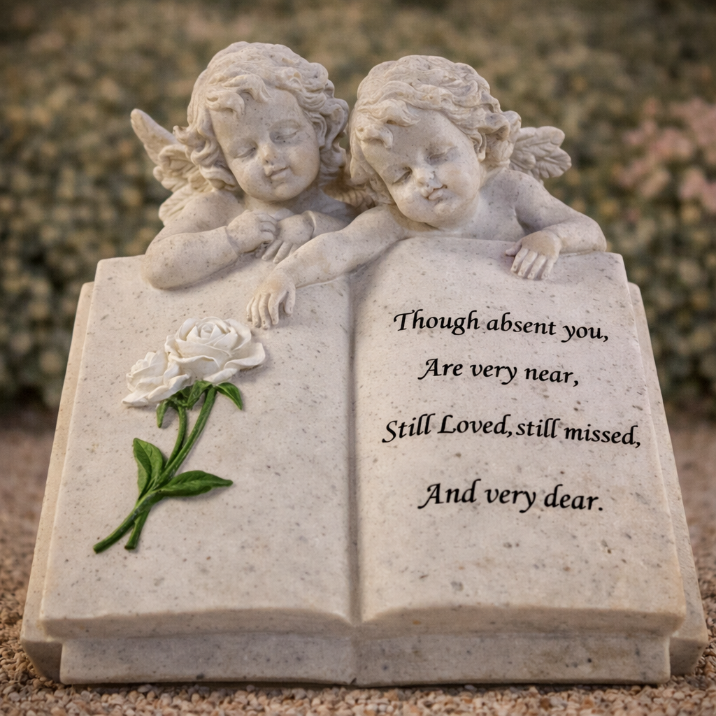 Memorial ornament featuring delicately sculpted angels on an open book