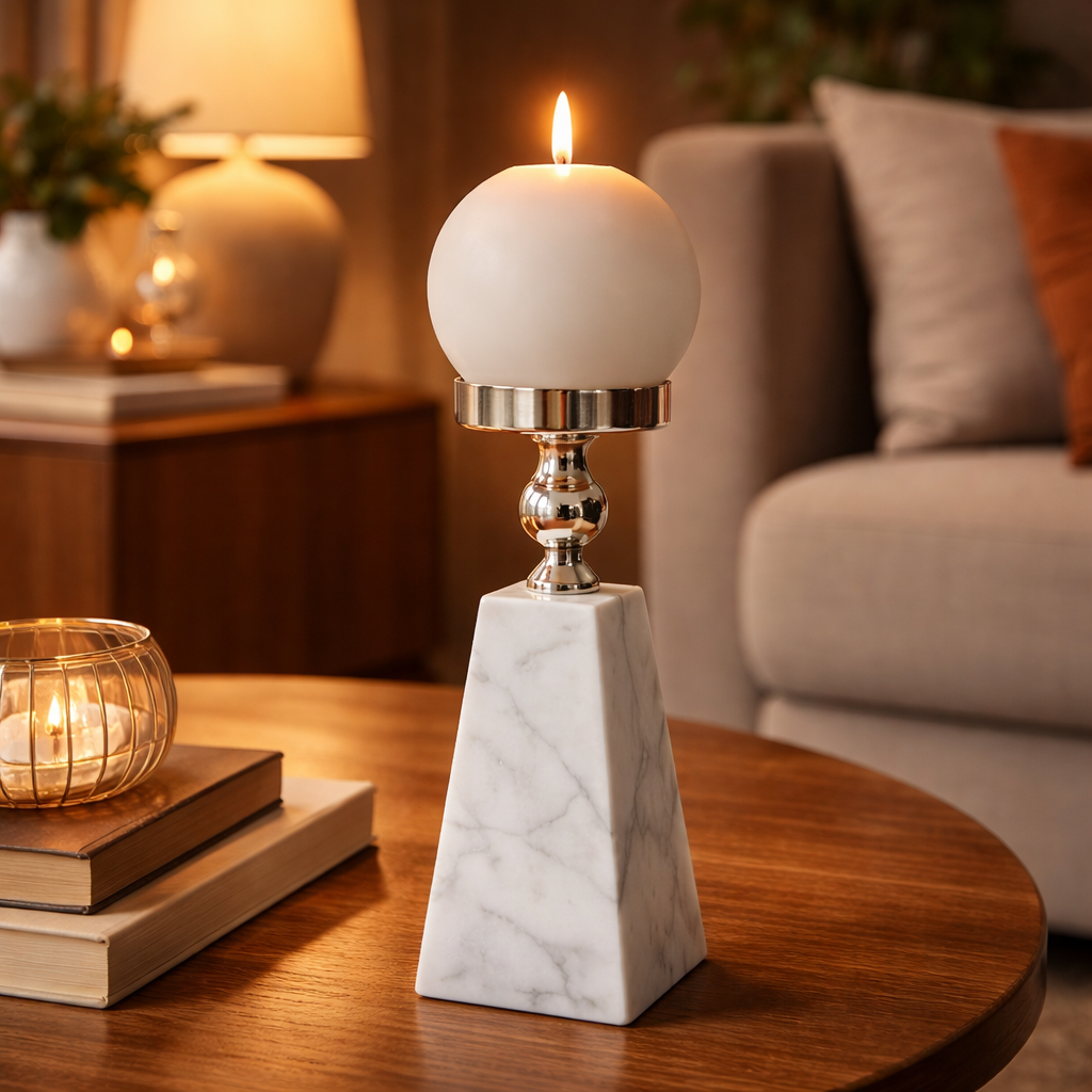 Its clean lines and compact silhouette make it ideal for styling on sideboards, coffee tables, or shelves, while the natural marble base adds texture and timeless appeal. Perfect for modern and classic décor alike, this candle holder is a stylish accent piece that enhances any space.